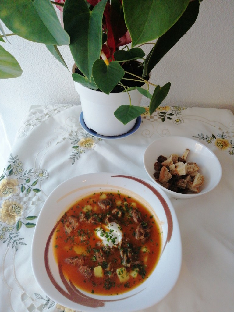Hier also das Rezept Gulas von meiner Mutter. Dieses Rezept eignet sich gut für ein grösseres Familienfest. Da würde ich dir empfehlen das Rezept doppelt zu kochen.